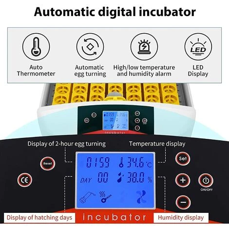 【Affichage numérique LED, avertissement intelligent de température et d’humidité】L’incubateur est équipé d’un affichage LED électronique qui peut afficher la température, l’humidité et d’autres informations de manière intuitive afin d’obtenir une surveillance efficace et un entretien précis. Il suffit d’ajouter de l’eau. Ajoutez des œufs et réglez la température et l’humidité désirées. Le ventilateur intégré répartit efficacement la chaleur uniformément dans tout l’incubateur.
