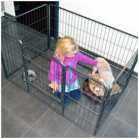 Ce modèle est fourni avec 8 éléments de clôture, qui peuvent être individuellement et rapidement alignés avec les barres correspondantes. Ainsi, vous pouvez garder le bec très petit et par ex. Connectez seulement 3 éléments les uns aux autres, ou utilisez la zone entière et connectez les 8 éléments ensemble. Bien sûr, vous pouvez également agrandir la zone à votre guise si vous achetez plusieurs fois le modèle respectif. Chaque modèle de l’enceinte pour chien contient un élément de clôture avec une porte pour un accès facile. Double verrouillage, il empêche même l’ami à quatre pattes le plus intelligent de s’échapper.