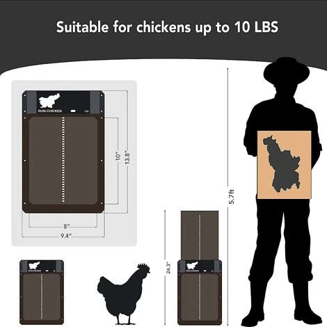 Nom : porte automatique sensible à la lumière pour poulailler Matériau : plastique Batterie : 3 piles AA (piles non comprises) Aimant : le moteur contient du magnétisme Fonction : perception de la lumière, relevable, étanche (IP44) Taille : 35 x 24 x 3,7 cm Couleur : noir rouge Emballage inclus : 1 * porte de poulailler automatique sensible à la lumière différence, la couleur de l’article peut être légèrement différente des images. Veuillez comprendre. * Conception légère : la porte automatique ultime pour chaque éleveur de poulet. Cet ouvre-porte automatique de poulailler vous surprend avec sa fonction étanche, sa conception robuste, son capteur de lumière, son interface utilisateur simple. et surtout un capteur de lumière, vous permettant de vous déplacer librement la nuit et pendant la journée. * Robuste et durable : adapté aux conditions météorologiques extrêmes et imperméable ; fonctionnera dans la neige, la pluie et d ust, et peut résister à des températures élevées et basses. * Facile à utiliser : il faut moins de 10 minutes pour installer la porte (pas de câblage compliqué ou de câblage requis). Boutons faciles à programmer. Vous pouvez régler une minuterie ou utiliser un capteur de lumière intégré (LUX).