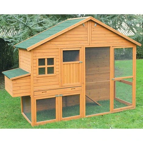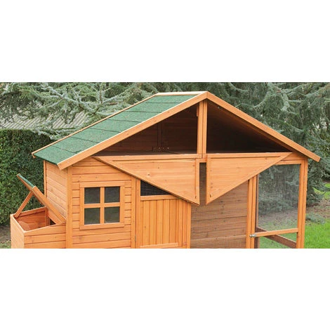 Que d’espace ! Ce grand poulailler est équipé de perchoirs, d’un pondoir extérieur, d’une trappe de sortie coulissante, d’une volière haute et facilement accessible pour les poules et les personnes qui s’en occupent, d’un grand tiroir à déjection grande profondeur et d’un très vaste grenier à rangements. En bois traité, avec toiture en toile goudronnée, livré en kit, il est le grand poulailler du moment !