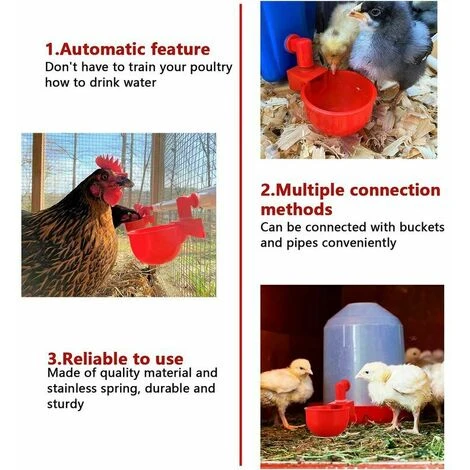 Fonction automatique : notre bol à volaille a un design automatique, l’eau peut sortir automatiquement en fonction de la quantité d’eau dans le bol, de sorte que vous n’avez pas à entraîner votre volaille à boire de l’eau, pratique à utiliserFiables à utiliser : ces arroseurs automatiques sont fabriqués en matériau de qualité et à ressort inoxydable, durables et robustes, sans fuite, sans danger pour vous à utiliser, pas facile à casser, vous pouvez les utiliser pendant une longue périodeFacile à installer et à nettoyer : cette tasse d’arrosage est facile à utiliser, peut être connectée avec un seau, un tuyau facilement, il est également simple à nettoyer, la valve de contrôle de l’eau est à l’intérieur, il n’y a pas de blocage dans le bol, ce qui la rend plus facile à nettoyerLarge gamme d’utilisation : le bol est conçu avec une tasse de grande taille, qui mesure environ 7,6 cm de diamètre. Ce bol est adapté pour les poules, canards, oiseaux, etc. C’est un article pratiqueMéthode de connexion : utilisez un foret de 9,5 mm pour créer des trous, 2,5 cm au-dessus de la base du seau ou utilisez un tube de 5/16ID + 7/16OD, il peut être connecté avec des seaux et des tuyaux facilement. Il est également facile à nettoyer