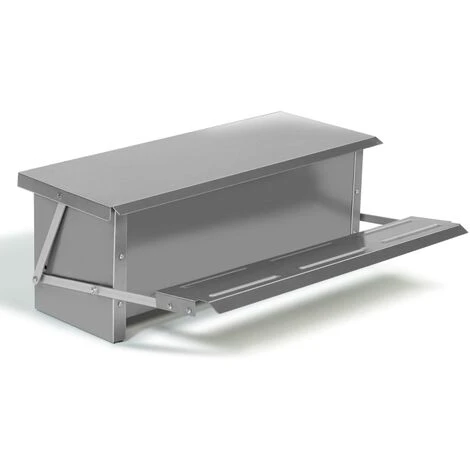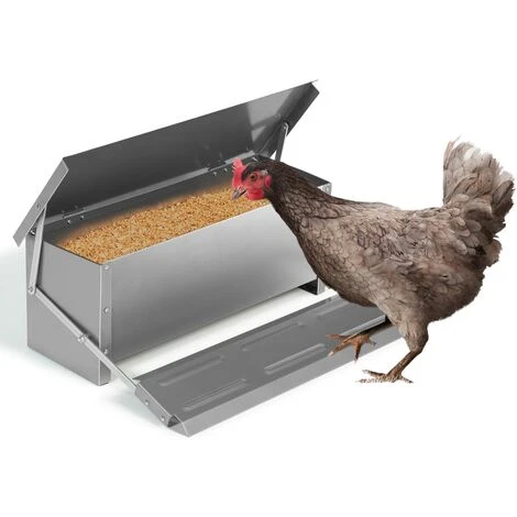 Descriptif de la mangeoire XXL pour poules et volaillesNourrissez vos poules en toute tranquillitĂ© pendant vos absences avec ce distributeur automatique XXL pouvant contenir jusqu’Ă 10 kg de nourriture.Les poules Ă©tant de grandes consommatrices de graines et lĂ©gumineux, vous n’aurez plus Ă vous soucier de savoir si elles ont assez de quantitĂ© grâce Ă ce rĂ©servoir pour grains XXL. ÉlĂ©ment incontournable pour un Ă©levage rĂ©ussi, la mangeoire est Ă©quipĂ©e d’un couvercle qui s’ouvre lorsque la poule se positionne sur la plateforme prĂ©vue Ă cet effet. Un poids minimum de 500 gr est nĂ©cessaire pour actionner le levier. Une telle conception Ă©vite aux oiseaux, rats ou autres nuisibles de voler la nourriture de votre Ă©levage. Ce fonctionnement intelligent joue sur le comportement alimentaire naturel de vos poules en leur permettant d’accĂ©der Ă leur nourriture, uniquement lorsqu’elles ont faim.Avec sa capacitĂ© de rĂ©serve XXL, la mangeoire offre de belles dimensions. Profitez d’un bac pouvant accueillir jusqu’Ă 10 kg de nourriture et mesurant 51 cm de longueur x 21 cm de largeur x 15,5 cm de hauteur. Vous pourrez nourrir plusieurs poules et cela pendant quelques jours selon la taille de votre Ă©levage. Pratique et rĂ©sistante, ce distributeur automatique innovant permet de conserver de manière optimale la nourriture de vos poules et Ă©vite le gaspillage grâce Ă ses parois fermĂ©es. Dimensions de la mangeoire XXL pour poules et volailles- Dimensions totales : Longueur 51 cm x largeur 38 cm x Hauteur 19 cm- Dimensions couvercle : Longueur 51 cm x largeur 21 cm- Profondeur du bac : 15,5 cm- Dimensions de la plateforme Ă levier : Longueur 51 cm x largeur 13 cm- Hauteur du levier : 8 cm- Poids nĂ©cessaire sur la plateforme pour ouvrir le couvercle : 500 gr- CapacitĂ© de rĂ©serve totale : 10 kg- MatĂ©riaux : acier galvanisĂ©Vous disposez de quelques poules ? DĂ©couvrez Ă©galement notre modèle XL 5 kg disponible sur notre boutique en ligne !