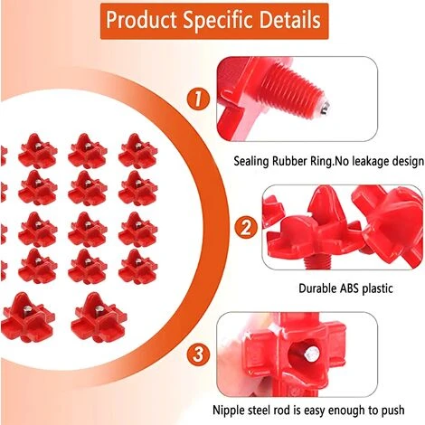 【Large utilisation】Notre nouveau buveur de poulet est un outil d’alimentation idéal pour les fermes. Peut être utilisé à la maison ou dans les élevages de poulets pour assurer un approvisionnement en eau durable et sain pour la volaille. Convient aux poulets, poulettes, canards, pigeons, oiseaux, dindes, oies, oiseaux sauvages, etc.Description du produit Caractéristiques : 1. Simple et pratique, facile à utiliser, notre nouvel abreuvoir à poulet peut être facilement installé sur le côté ou au fond du seau. 2. Facile à utiliser Léger, de petite taille, facile à transporter et à installer. Il fournit suffisamment d’eau propre et suffisante pour les poulets sans gaspiller d’eau. 3. Notre nouvel abreuvoir pour poulets peut être utilisé pour étendre un système d’approvisionnement en eau existant, ou peut être attaché à un seau ou un seau pour créer une mangeoire par gravité. Les pièces sont étroitement connectées et étanches, et l’interrupteur à ressort à clapet à bille hélicoïdal rempli de précision peut stocker chaque goutte d’eau. 4. Les dimensions spécifiques de chaque partie du produit sont indiquées dans l’image Informations sur le produit Couleur : Rouge Matériau : matériau ABS de haute qualité + acier inoxydable 304