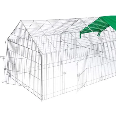 Cet enclos d’extĂ©rieur facile Ă monter, avec un dessus inclinĂ©, est couvert d’un tiers de sa surface par une toile verte contre le soleil.