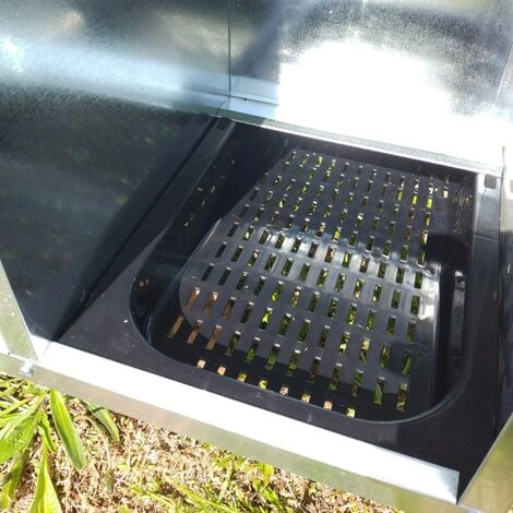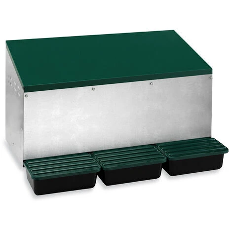 Pondoir pour poule en métal comprenant trois nichoirs avec entrée à l’intérieur et bacs de récupération des œufs à l’extérieur. Dimensions : L80 x l52 x H48 cm Structure en métal galvanisé Fonds en plastique avec bacs de récupération Toit peint en vert Conçu pour être accroché à une paroi ou monté sur des pieds Marque : Gaun