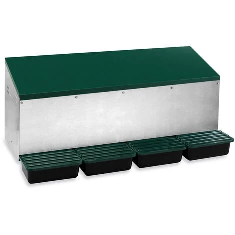 Batterie de pondoirs pour poule en métal composée de quatre nichoirs avec entrée à l’intérieur et bacs de récupération des œufs à l’extérieur. Dimensions : L106 x l52 x H48 cm Structure en métal galvanisé Fonds en plastique avec bacs de récupération Toit peint en vert Conçu pour être accroché à une paroi ou monté sur des pieds Marque : Gaun