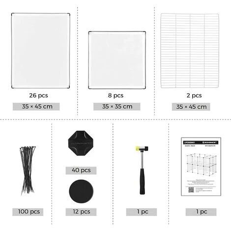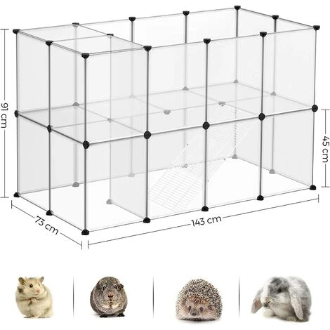 Panneaux transparentsEnvie de savoir ce que fait votre petite boule de poils ? Jetez un coup d’œil à travers et vous le saurez ! | Conception sans espaceLes panneaux en plastique PP et les connecteurs en ABS s’emboîtent étroitement pour réduire les chances de passage des petits animaux. | Maillet en caoutchoucTapotez les joints avec le maillet en caoutchouc inclus pour éliminer les petits espaces. Avec lui l’assemblage se fait plus rapidement et plus facilement ! | Facile à nettoyerNettoyez facilement les taches sur les panneaux en plastique PP grâce à un chiffon humide. |