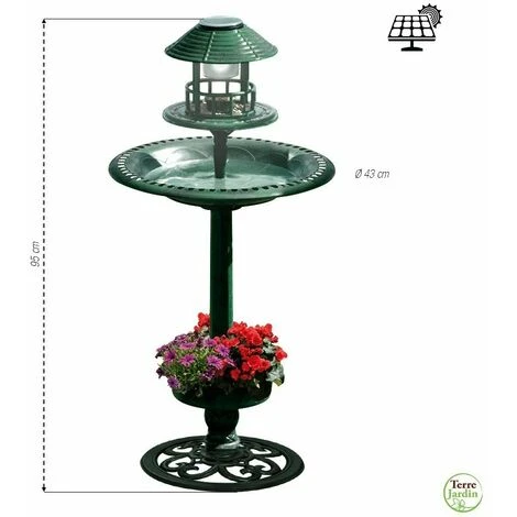 - La vasque est composée d’une lampe solaire, d’un perchoir pour oiseaux, d’une vasque mangeoire et d’une jardinière pour les fleurs.